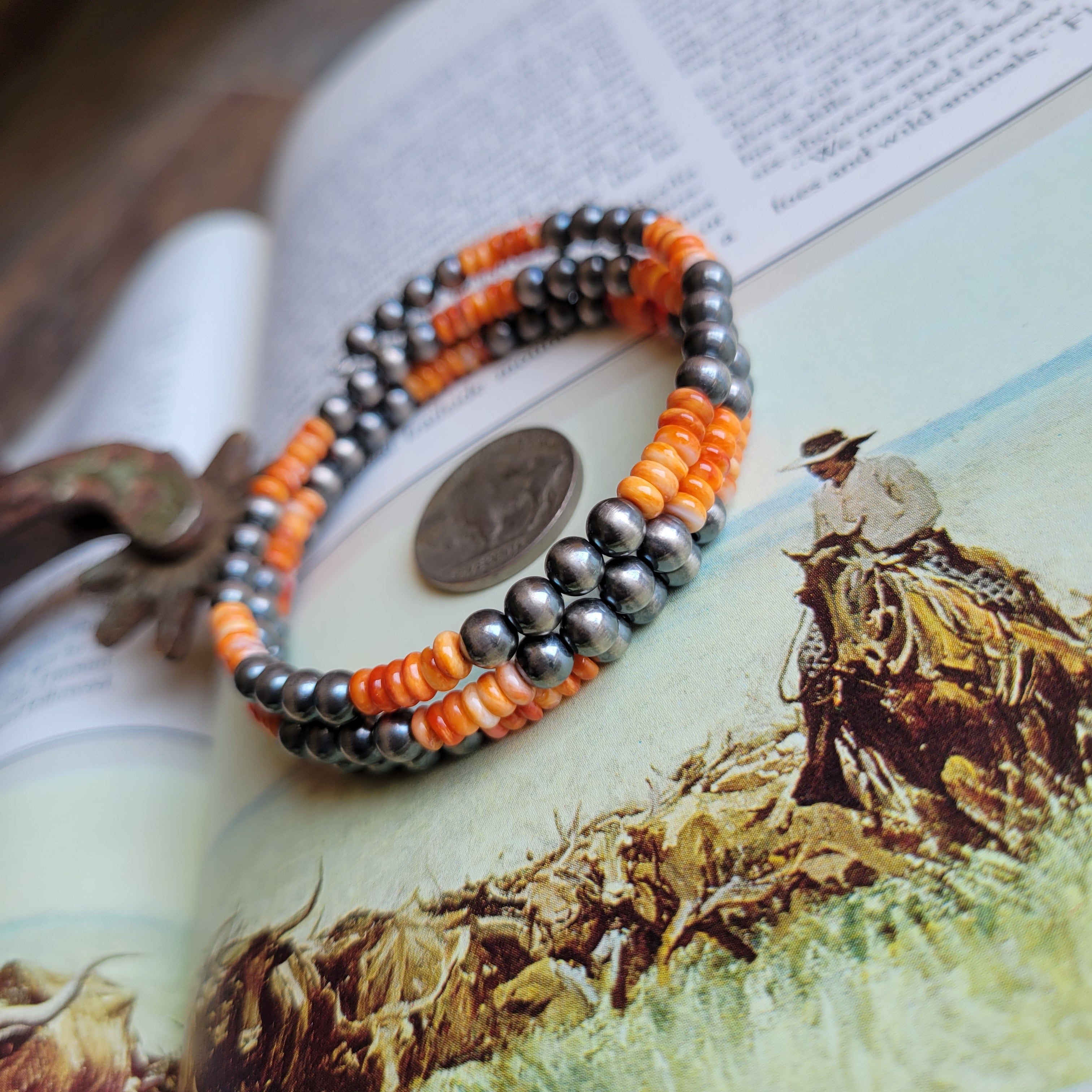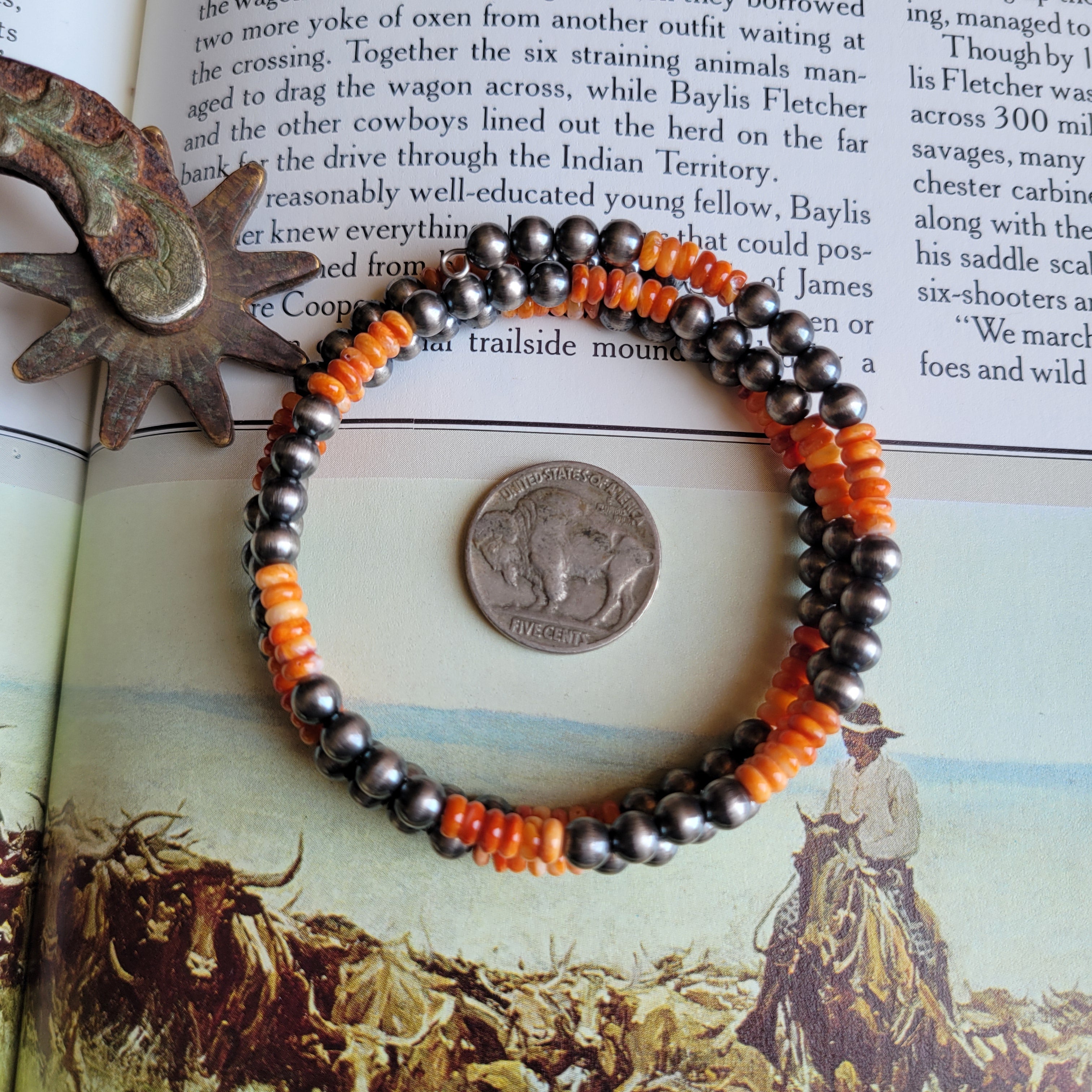 Spiny Oyster & 5mm Sterling Silver Pearl memory wire wrap bracelet.