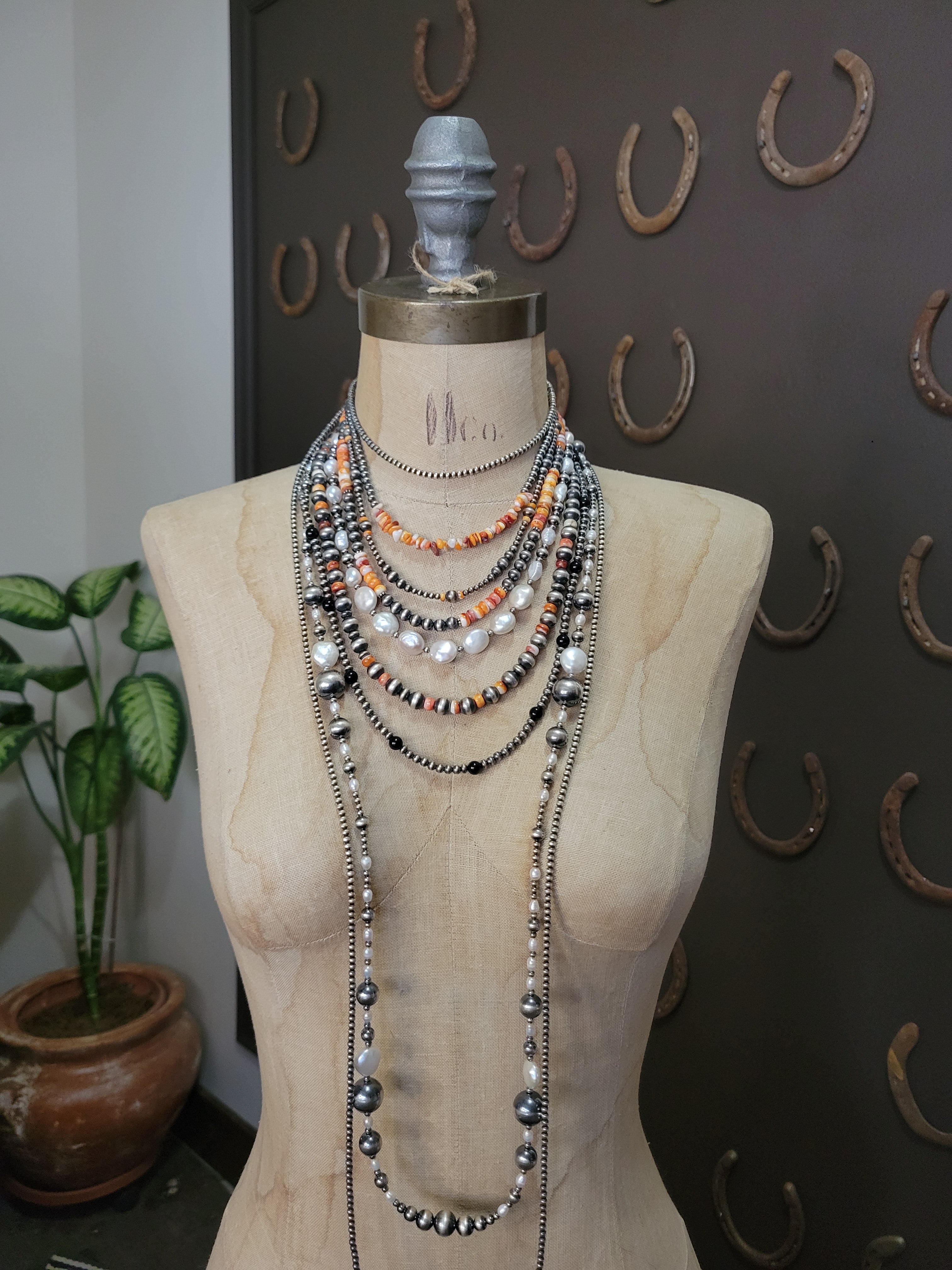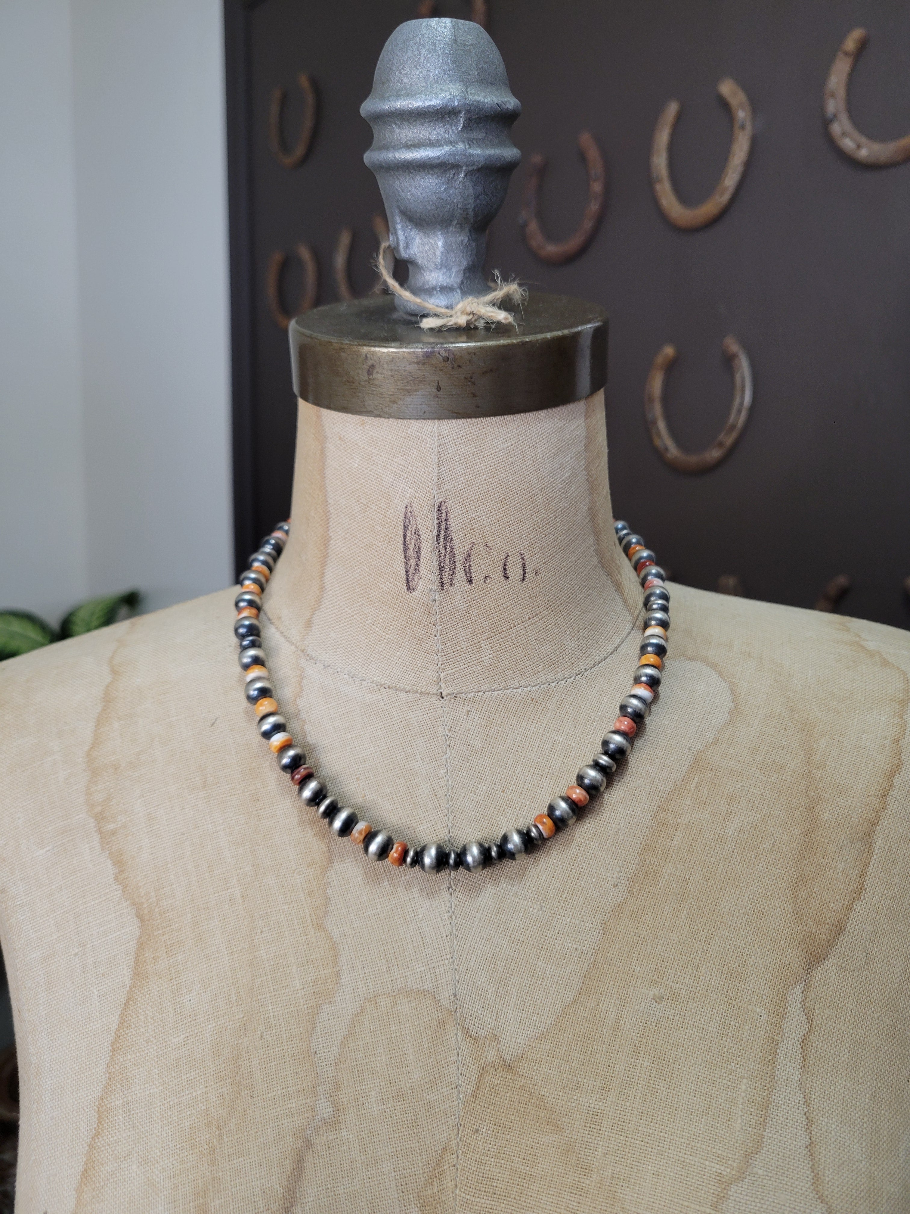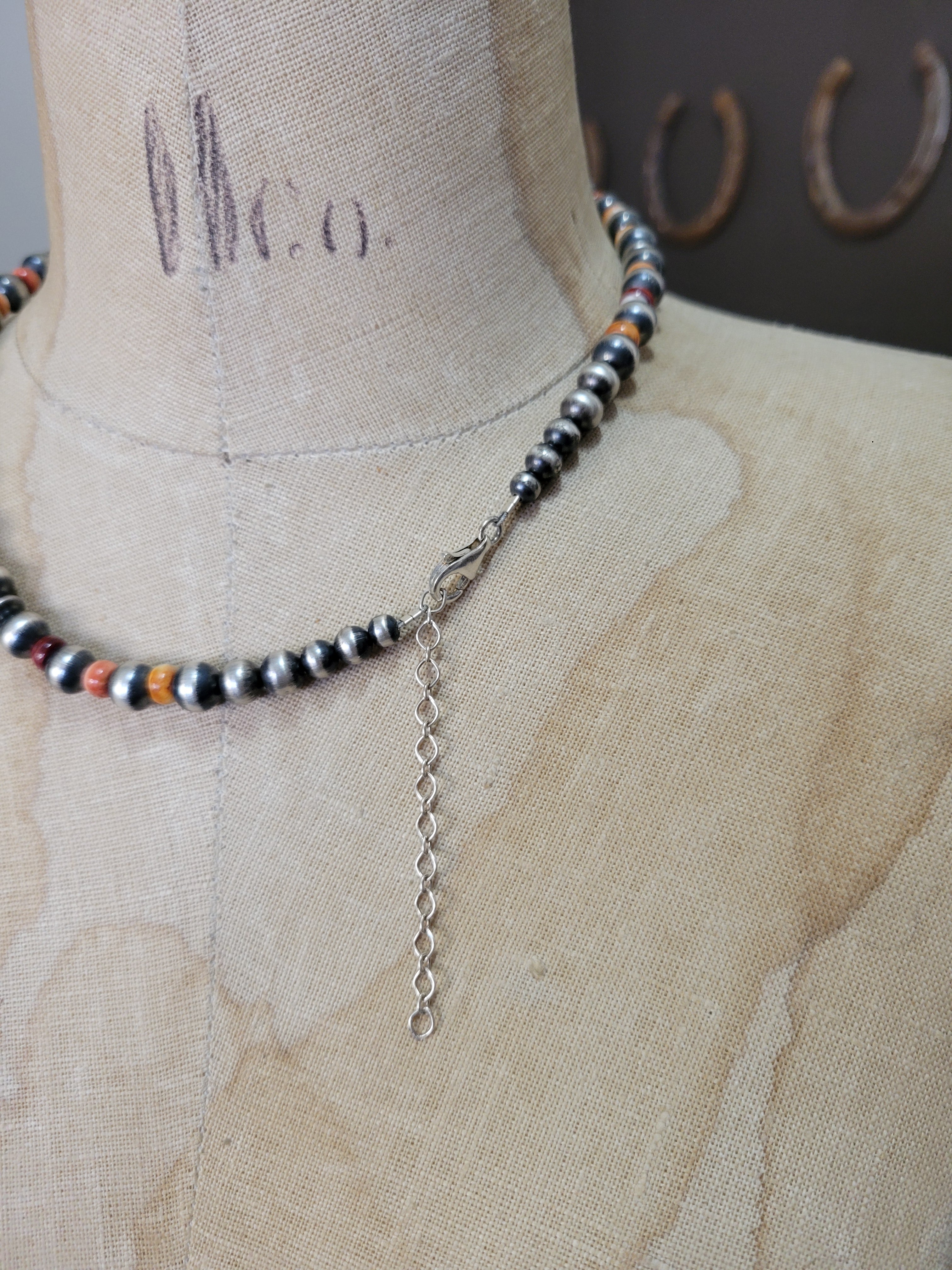 Versatile 18-inch sterling silver pearl necklace with vibrant orange spiny oyster accent beads, complete with a 2.5-inch extender chain for adjustable fit. The 8mm silver beads pair beautifully with the warm, textured spiny oyster details, creating a striking southwestern aesthetic. Extender chain allows you to customize the length to suit your style and comfort.