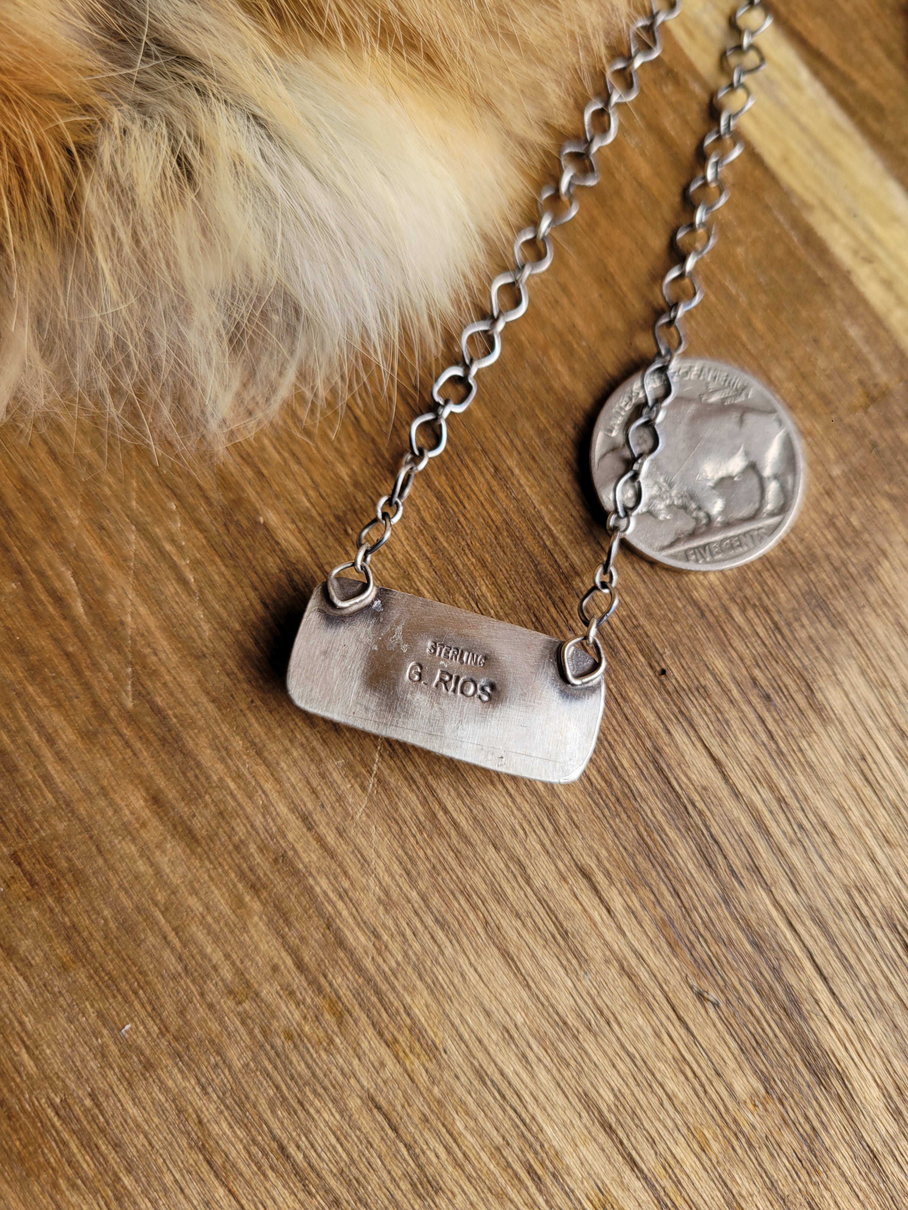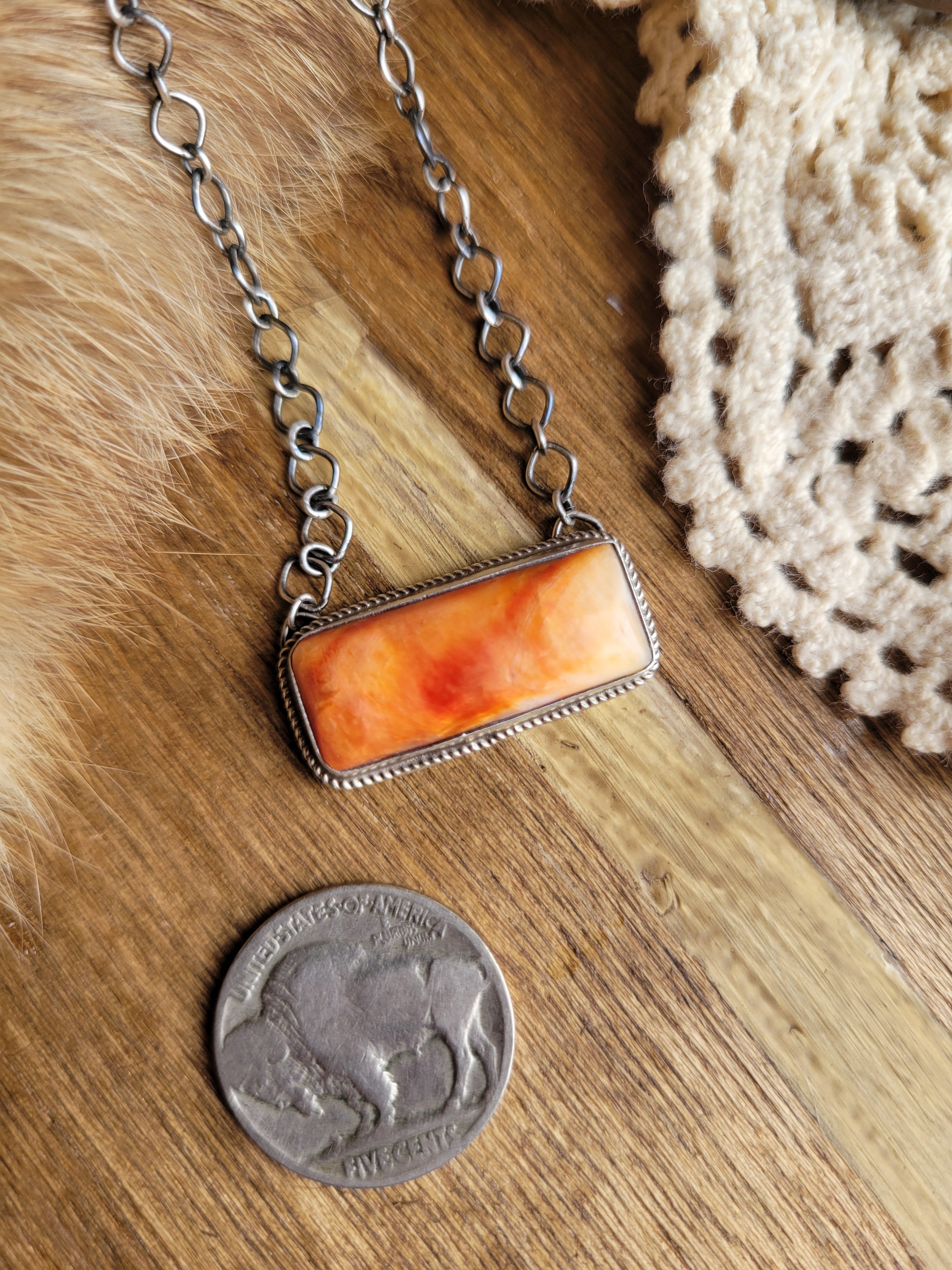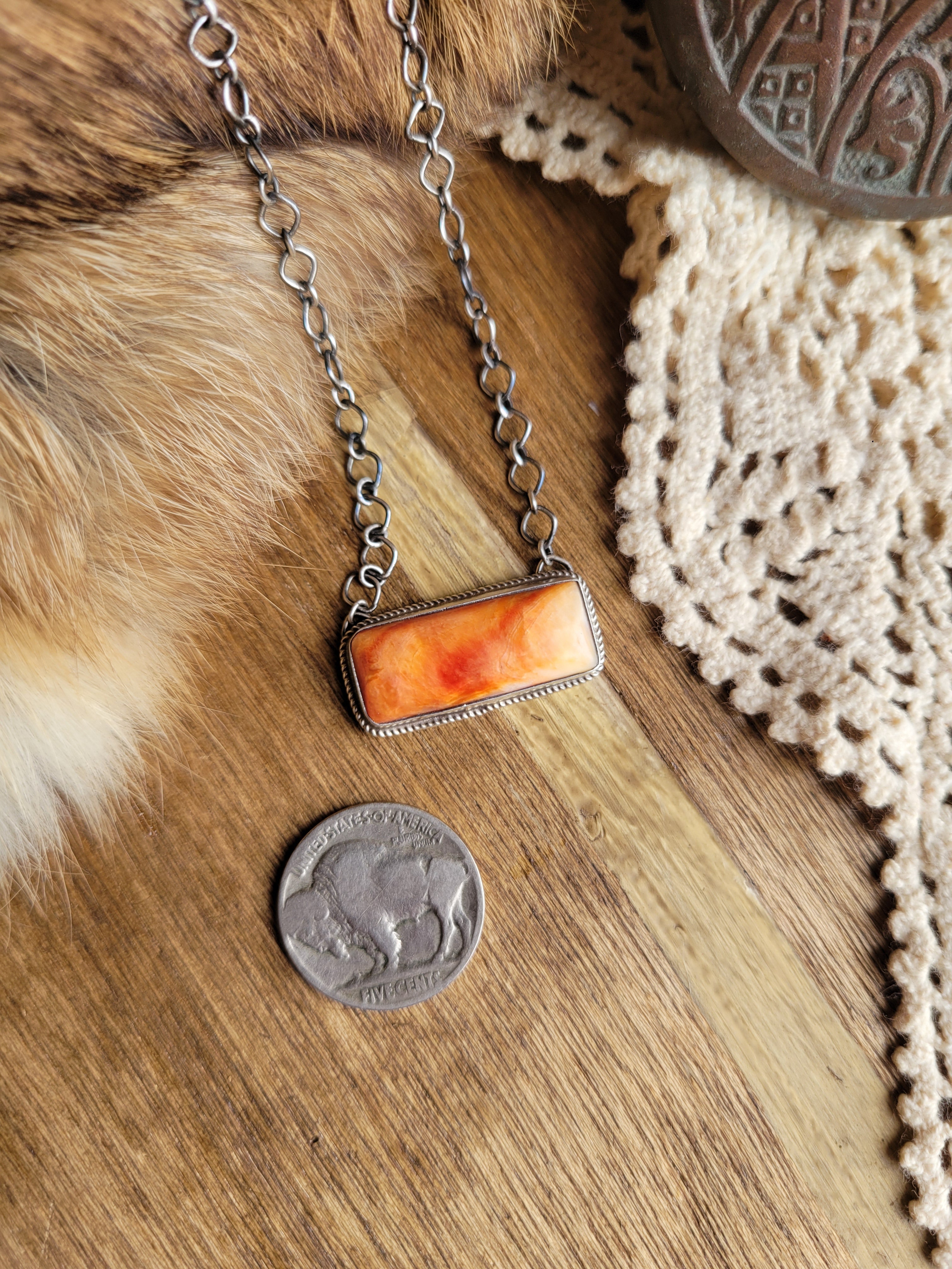 Orange Spiny Oyster Shell Bar Necklace Handcrafted by Gloria Rios and signed "G. RIOS," this striking necklace features a vibrant orange spiny oyster shell bar that catches the light beautifully. The polished bar measures just over 1 inch, creating an elegant focal point without overwhelming the neck. Strung on an 18.75-inch chain, it can be worn at full length or adjusted shorter for a custom fit. A genuine piece of Native artistry that brings warmth and natural beauty to any collection.