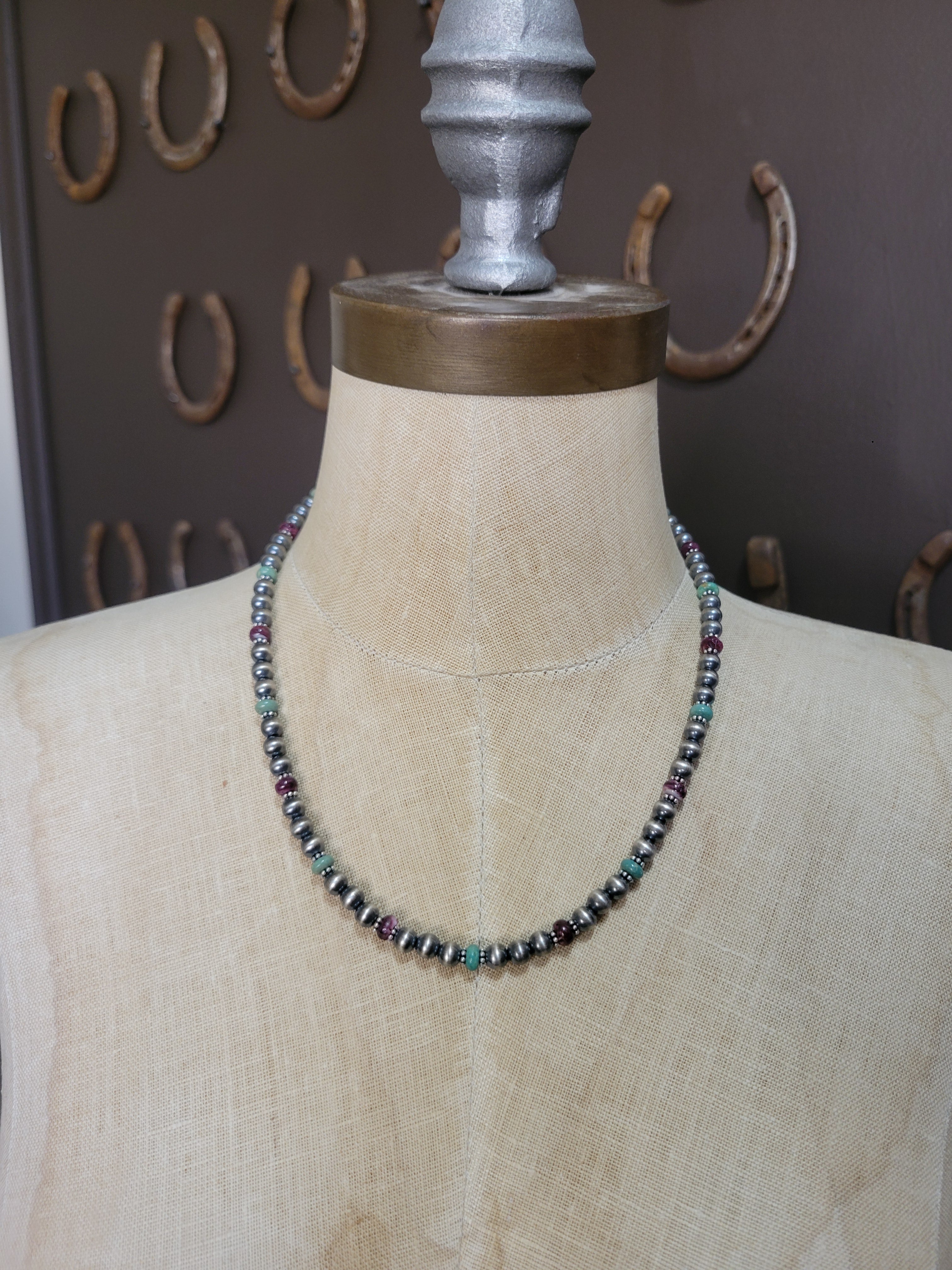 Elegant 18-inch sterling silver pearl necklace featuring 6mm sterling pearls accented with vibrant purple spiny oyster and turquoise stones. Adjustable 2-inch extender allows customizable fit. Handcrafted with authentic details for a timeless western look.