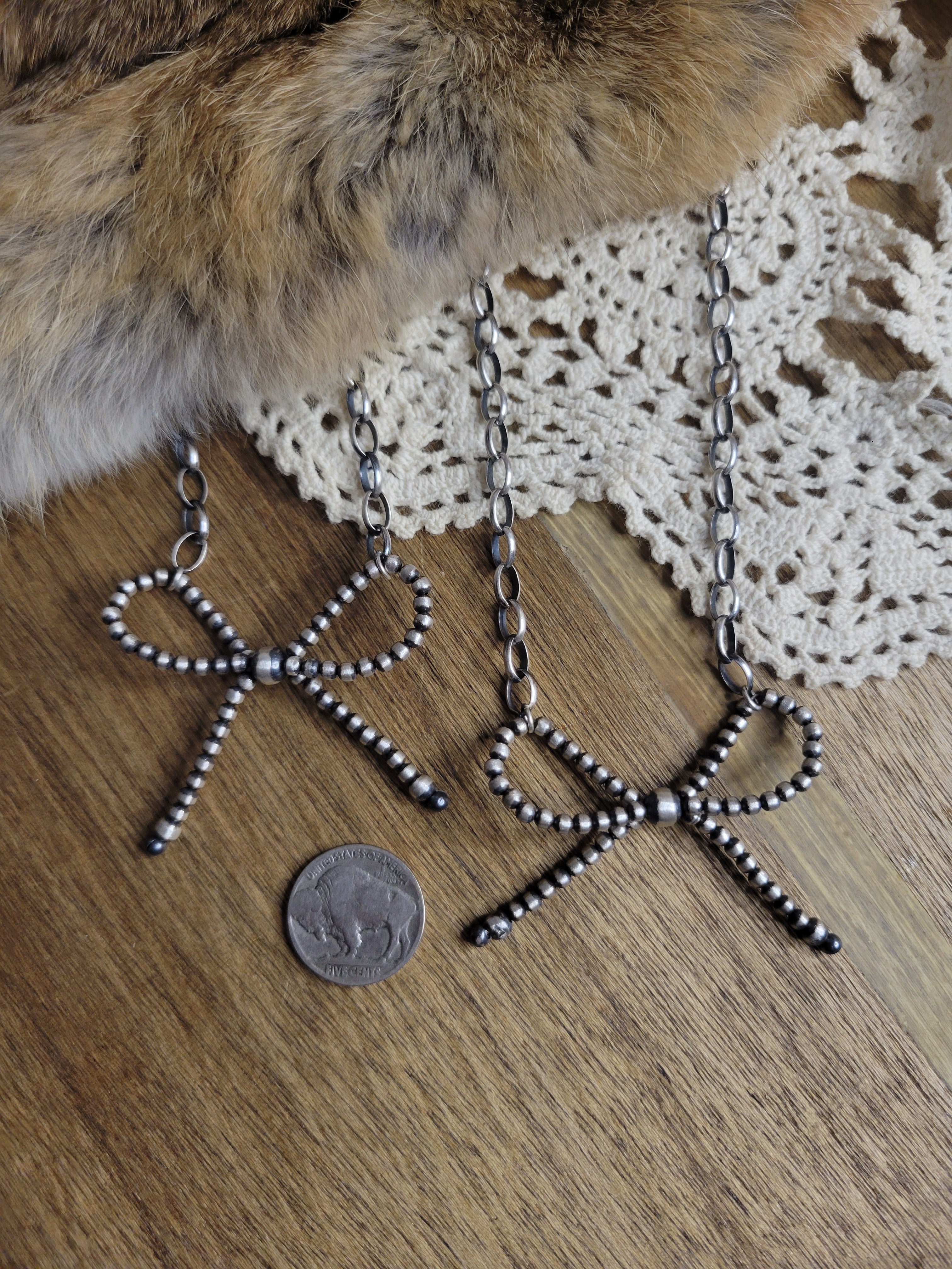 Elegant sterling silver pearl bow necklace ranging from 3-6mm pearls, suspended from a sterling silver chain. The bow pendant measures approximately 2" wide and hangs from a 20" adjustable chain that can be worn shorter for versatile styling. Perfect for adding a touch of girliness to any outfit.