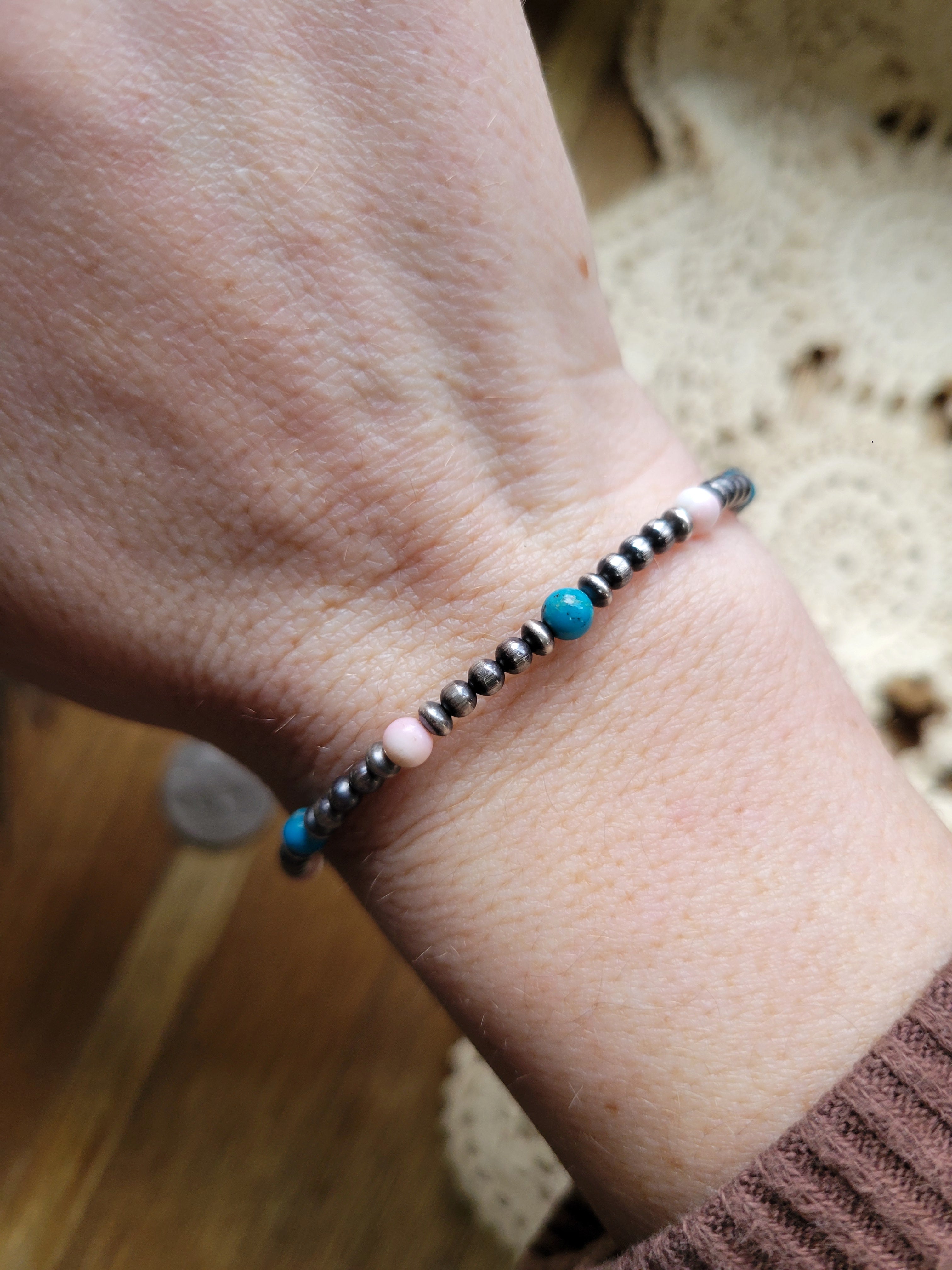 - Styles: Silver Pearl Stretchy Bracelet with Pink and Turquoise