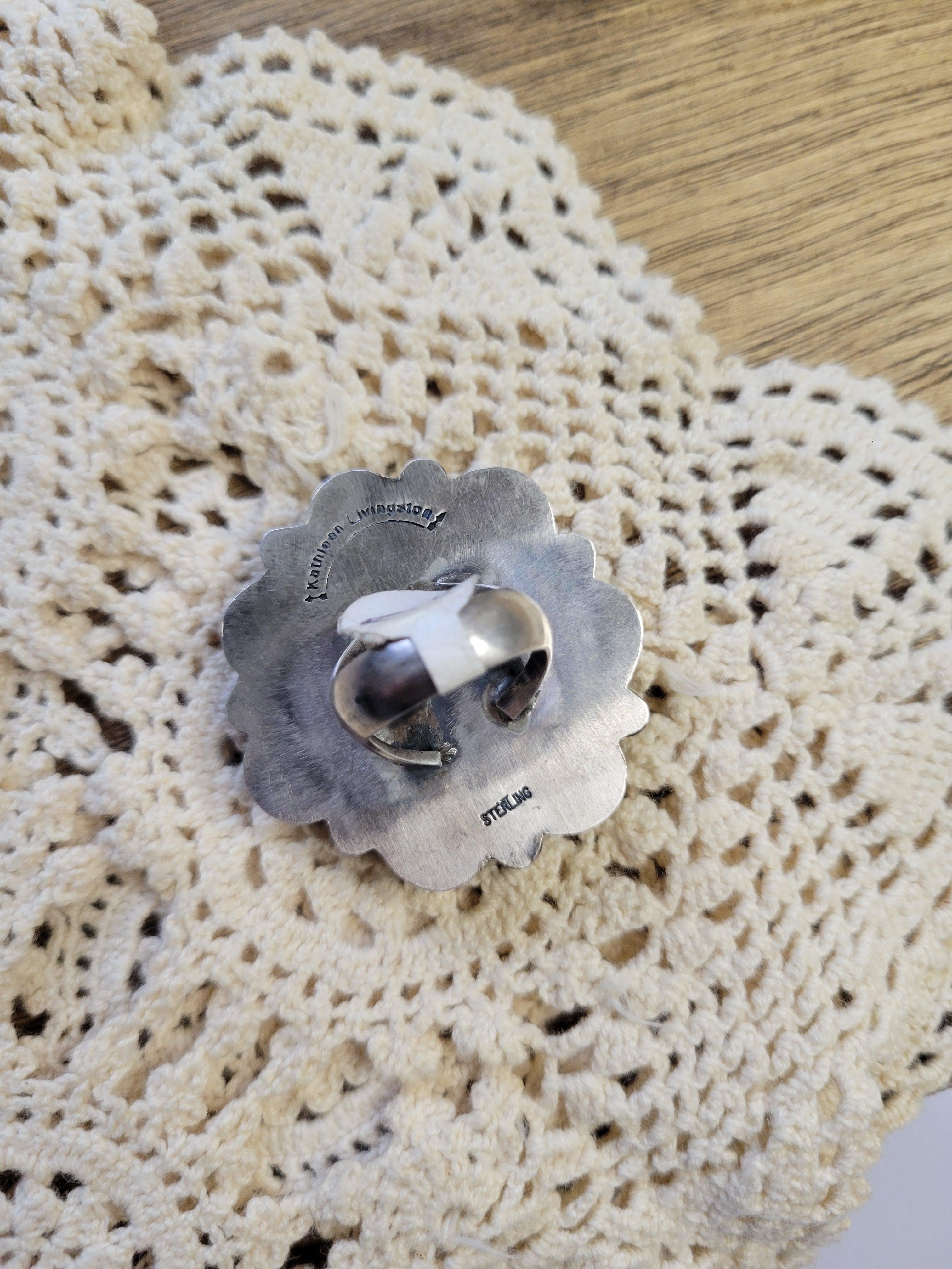 Handcrafted by Native American artist Kathleen Livingston, this stunning Blue Moon Turquoise cluster ring showcases vibrant turquoise stones set in sterling silver. Each piece captures the natural beauty and artistry of authentic southwestern design. A bold statement ring that brings timeless elegance and cultural heritage to your collection.