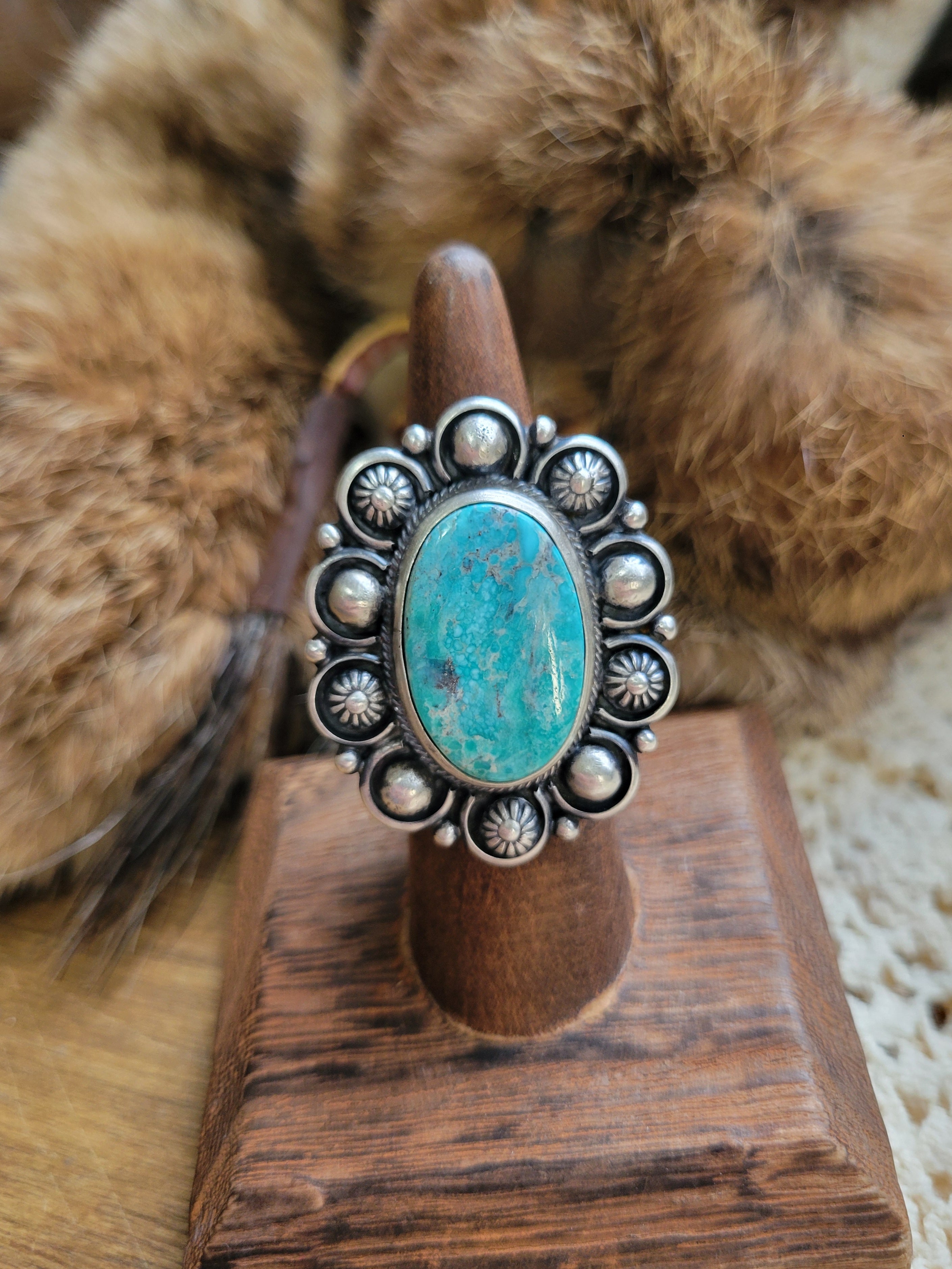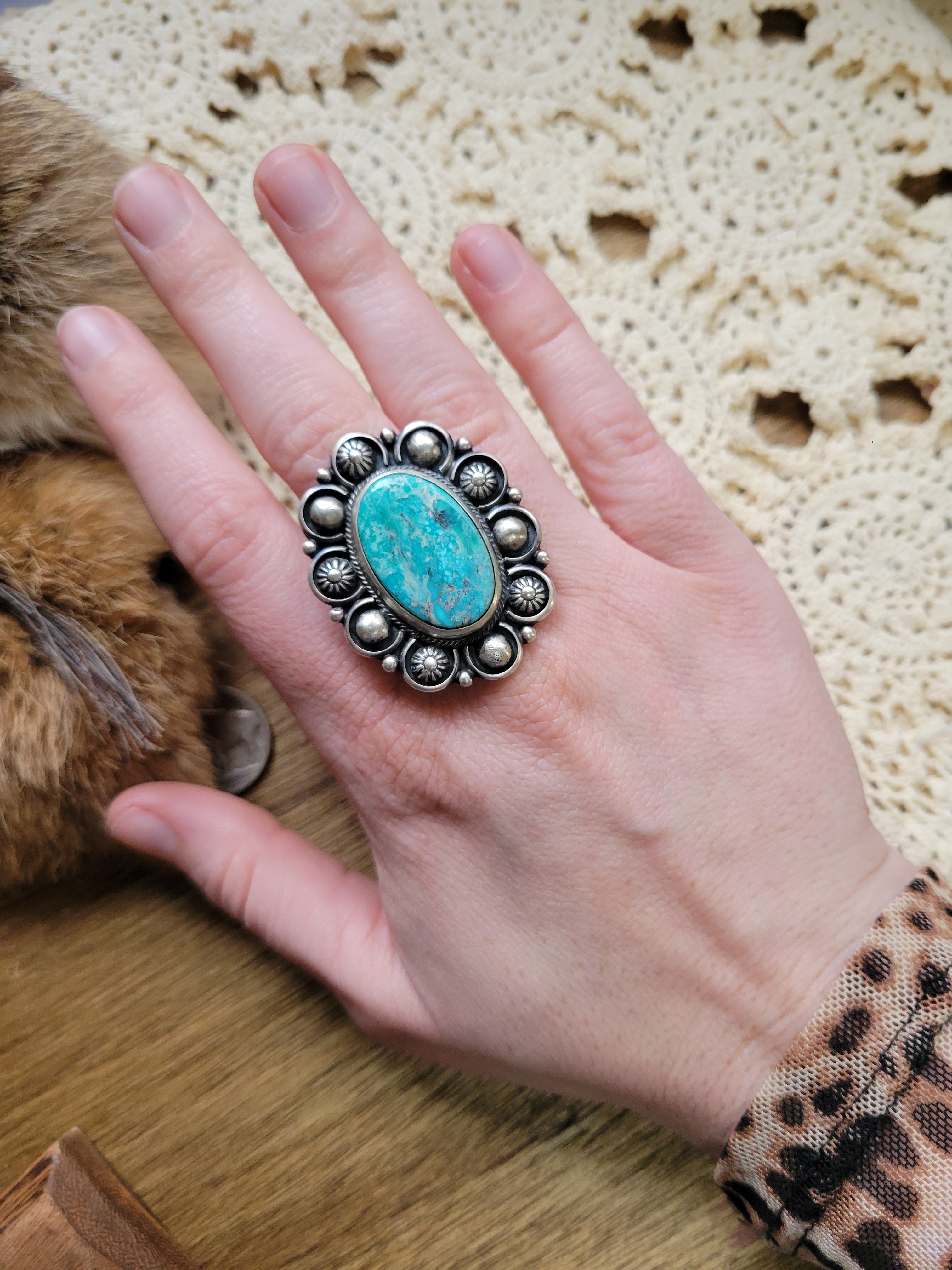 • Style: White Water Turquoise Statement Ring with heavy detailed silver work