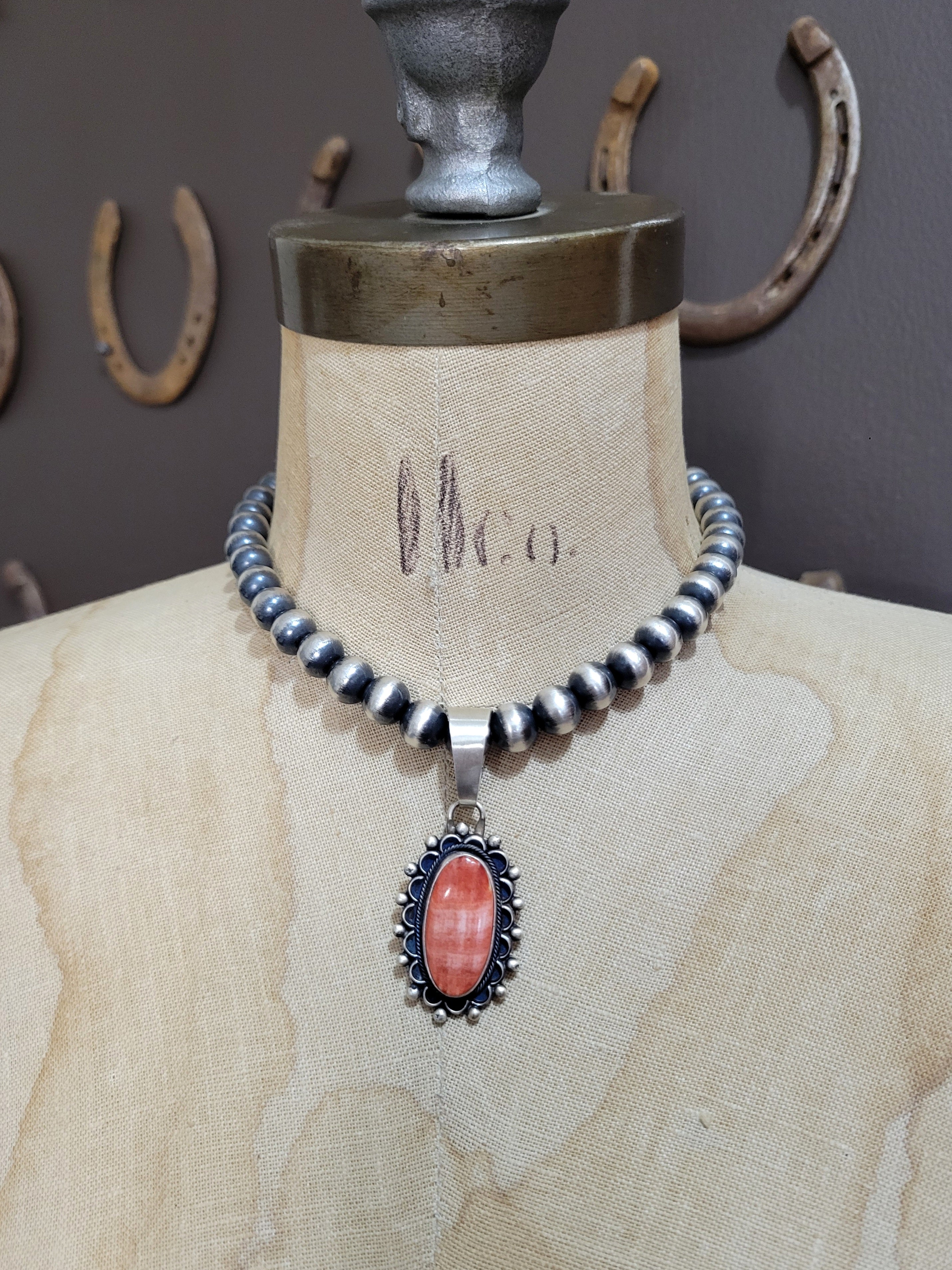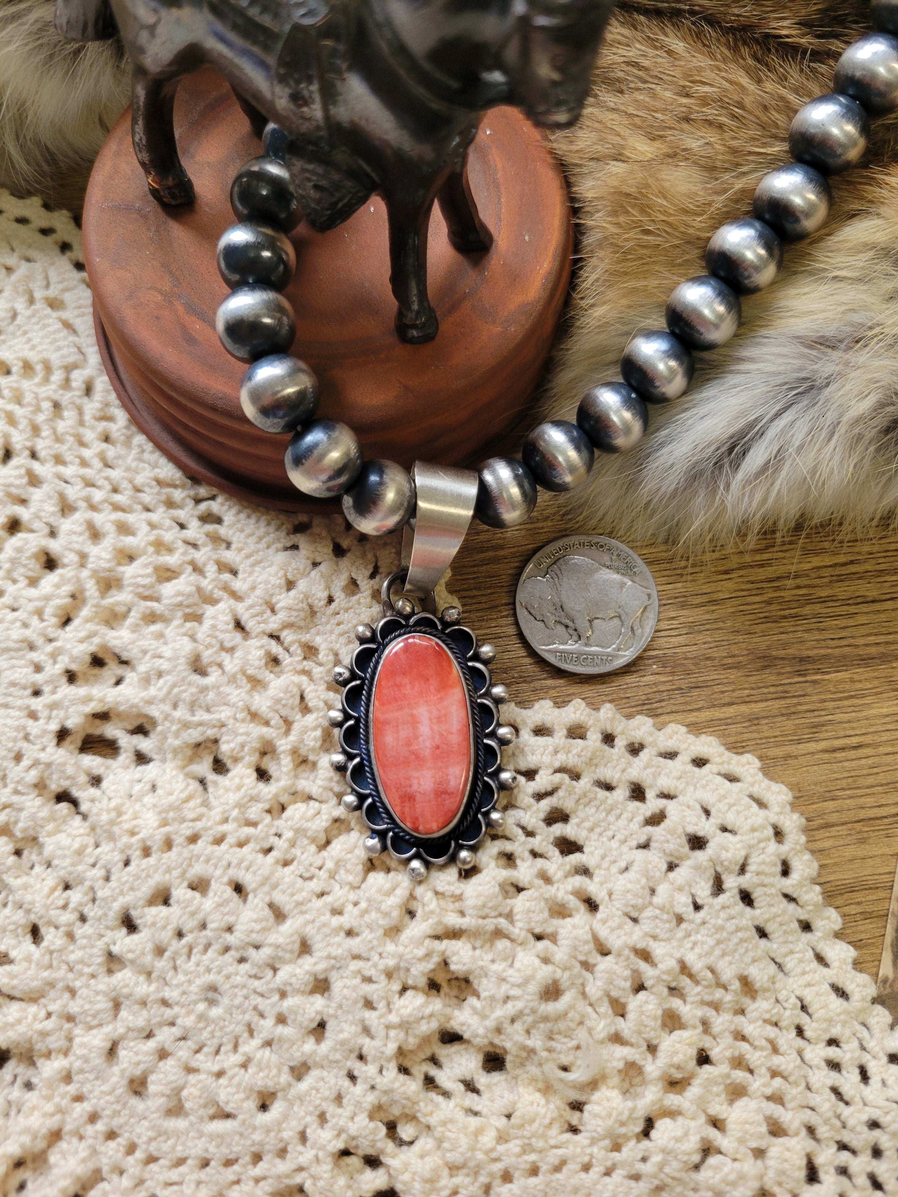 Meet your new favorite accessory! This playful Red Spiny Oyster pendant brings southwestern flair with its fiery red shell and artisan-crafted sterling silver setting. Handmade and signed by a native artist Jameson Garcia, it's a genuine conversation starter. The 12mm bale opening gives you endless styling possibilities with your favorite chains and cords. (Pendant only—the 10mm pearl necklace is just here to show you the perfect size!)